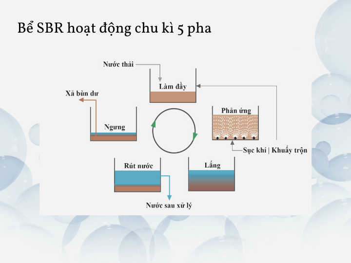 SBR thực hiện quá trình xử lý theo chu kỳ 5 giai đoạn trong mỗi bể, bao gồm: (1) Làm đầy (2) Sục khí (3) Lắng (4) Rút nước (5) Nghỉ. Quá trình xử lý được điều khiển và giám sát tự động để đảm bảo chất lượng nước thải được xử lý đạt tiêu chuẩn và an toàn cho môi trường.