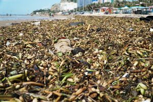 Lục bình, cành cây, đồ nhựa… từ cửa sông khi gặp gió nghịch mùa theo ...